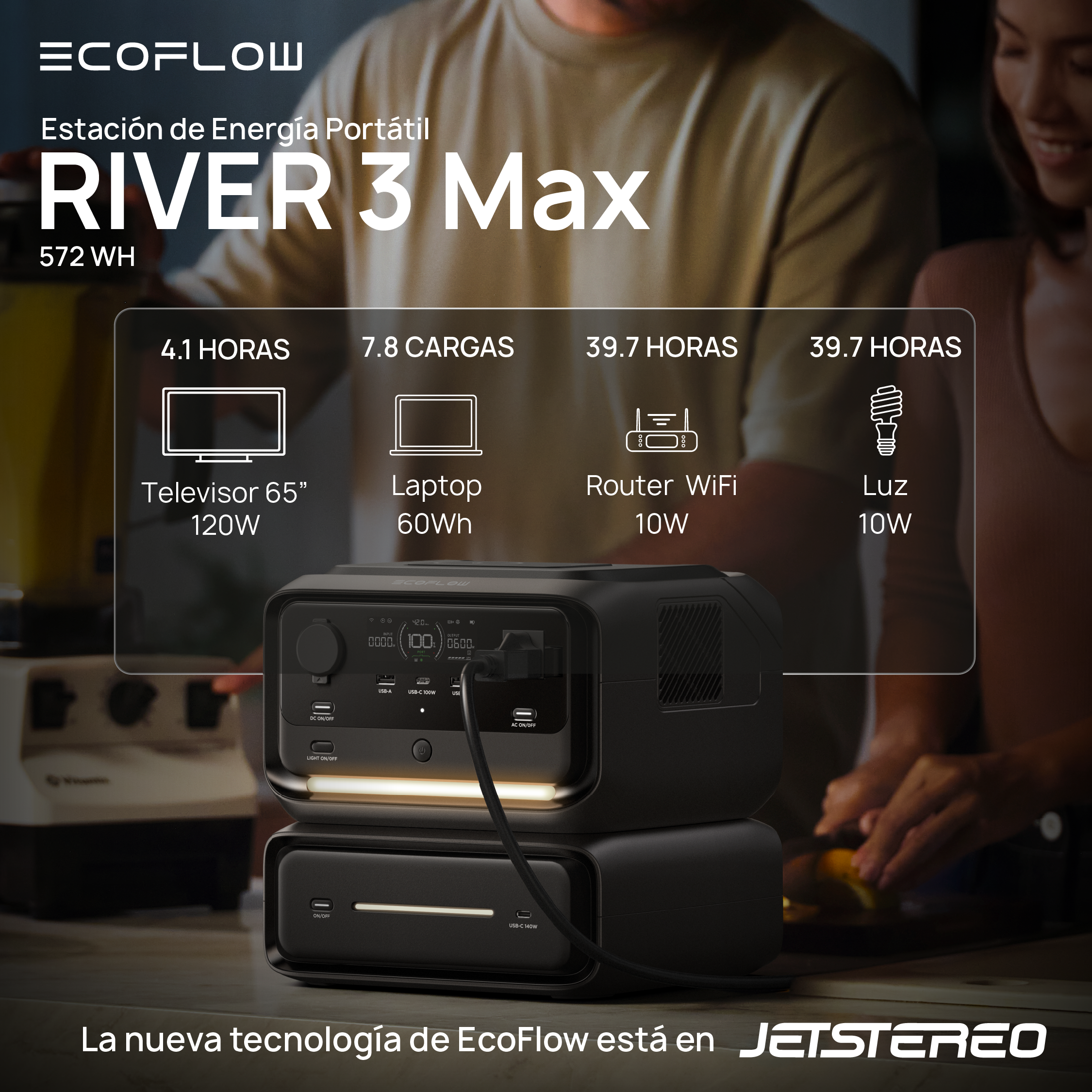 El EcoFlow RIVER 3 Max brindó mayor autonomía sin sacrificar portabilidad, con 572 Wh de capacidad y la misma potencia de salida de 600 W. Su diseño compacto de 7.8 kg lo convierte en un aliado durante cortes de luz prolongados o escapadas familiares. Ofrece hasta 39 horas de energía para un router, 10 horas para un ventilador de 30W y 7.8 cargas completas de laptop.