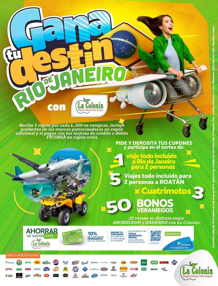 La promoción "Gana tu destino Río de Janeiro con Supermercados La Colonia", estará vigente del 28 de febrero al 05 de mayo en las tiendas de Supermercados La Colonia de la zona norte (San Pedro Sula, El Progreso, Tela, La Ceiba, Choloma, Villanueva, Santa Rosa de Copán, La Lima, Olanchito y Tocoa) El sorteo se realizará el 09 de mayo. La lista oficial de ganadores será publicada en la página de Facebook de Supermercados La Colonia.