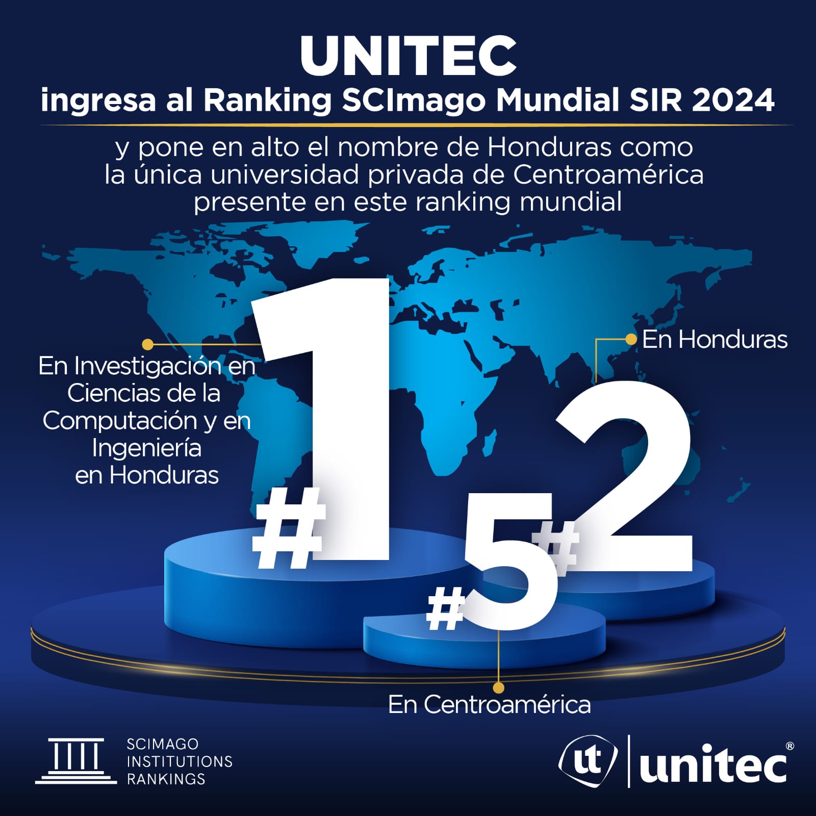 UNITEC es la primera y única universidad privada de Centroamérica que cumplió los criterios para ser incluida en este ranking de instituciones investigadoras. Este nuevo logro consolida a UNITEC como la universidad privada número 1 en investigación en Centroamérica y la número 5 entre todas las universidades públicas y privadas de esta región, según los criterios del SIR 2024.
