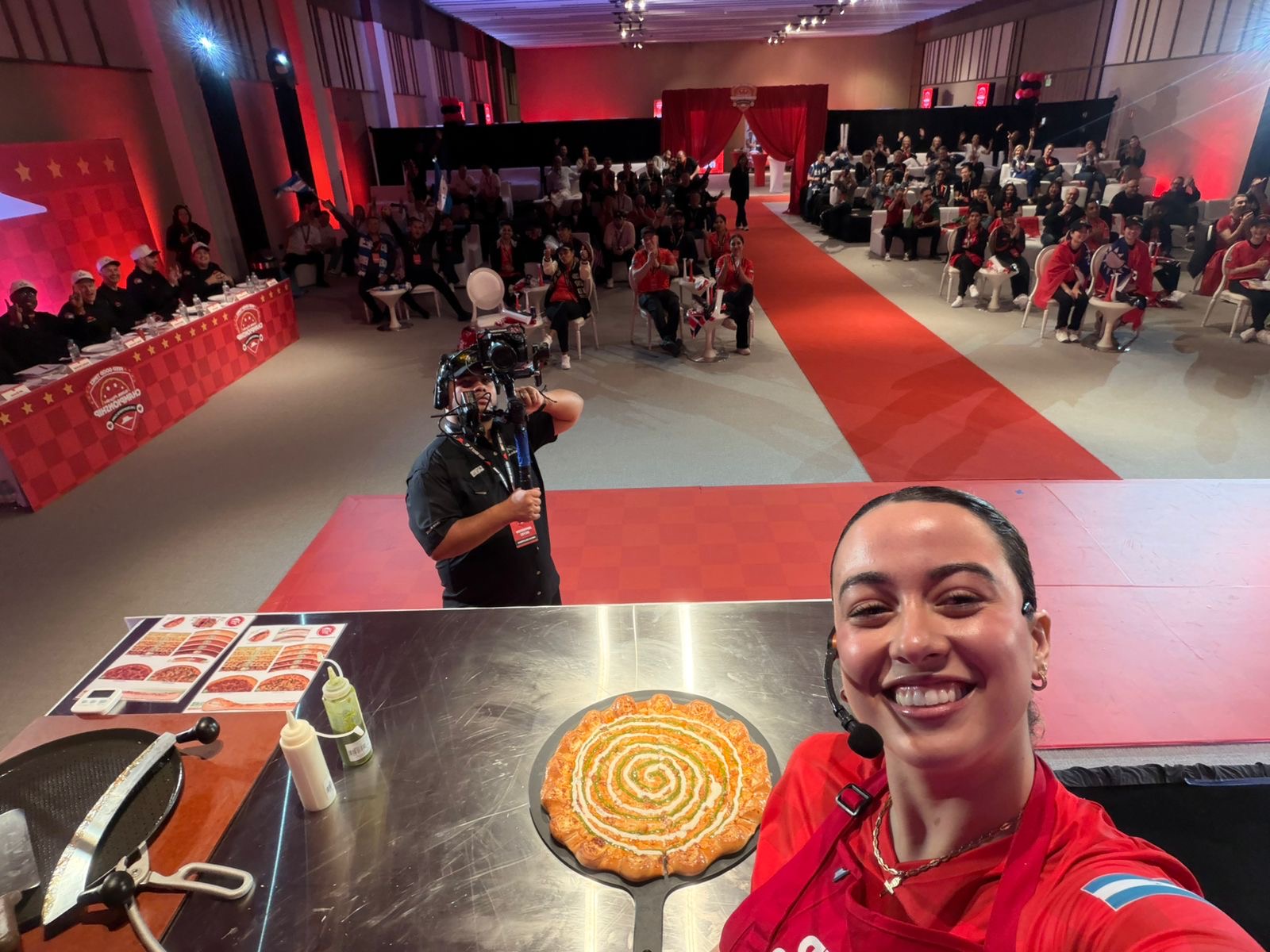Este año Pizza Hut Honduras nos representó con Mauricio Murillo en la mesa de producción quién destacó por su compromiso con la calidad, cuidando cada detalle desde la masa y la salsa hasta los ingredientes finales, poniendo pasión en cada momento durante la elaboración de una Pan Pizza Suprema y una Hut Cheese Suprema. Héctor Reyes en la mesa de corte encargado de validar la calidad del producto, garantizando que cada pizza cumpliera con los estándares de la marca en sabor, textura, distribución de ingredientes y presentación. Angélica Nuñez nuestra Chef Innovation Lab destacando su participación en el segmento de innovación y con su impecable traducción de sus compañeros en conjunto con el Centro de Apoyo y Operaciones, cuyo aporte fue clave para alcanzar este resultado excepcional.