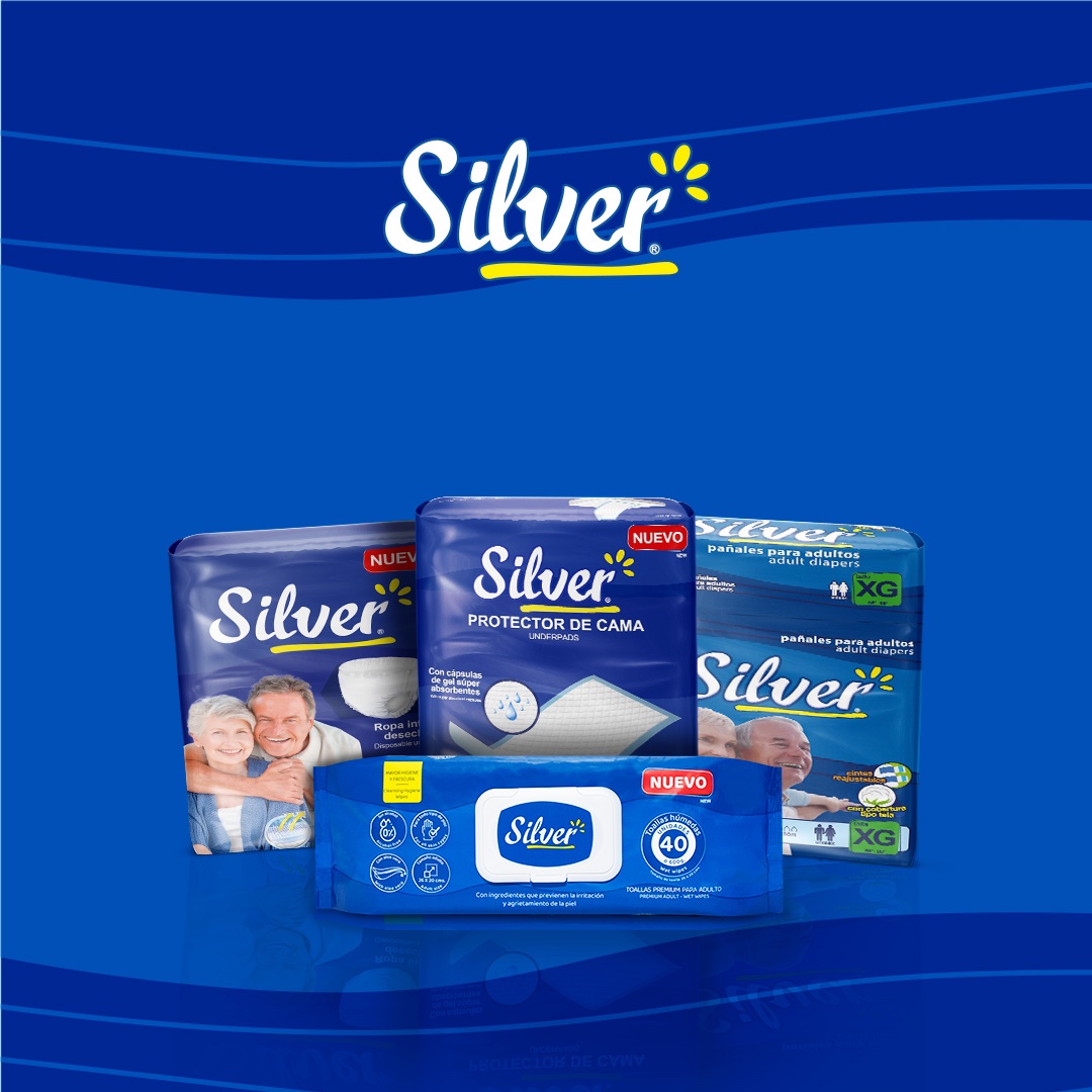 La marca para adultos mayores Silver, conoce lo delicada que es la piel de las personas de la tercera y cuarta edad, por ello se enorgullece presentar su línea de pañales con máxima absorción para incontinencia severa, ropa interior con control de olor para o incontinencia moderada con barreras antiescurrimiento y ajuste anatómico, asi como los protectores de cama y Toallitas húmedas para una limpieza total y refrescante. Los productos Silver producidos por la prestigiosa casa Absortex, son diseñados específicamente para prevenir problemas comunes como salpullidos y llagas en la piel.