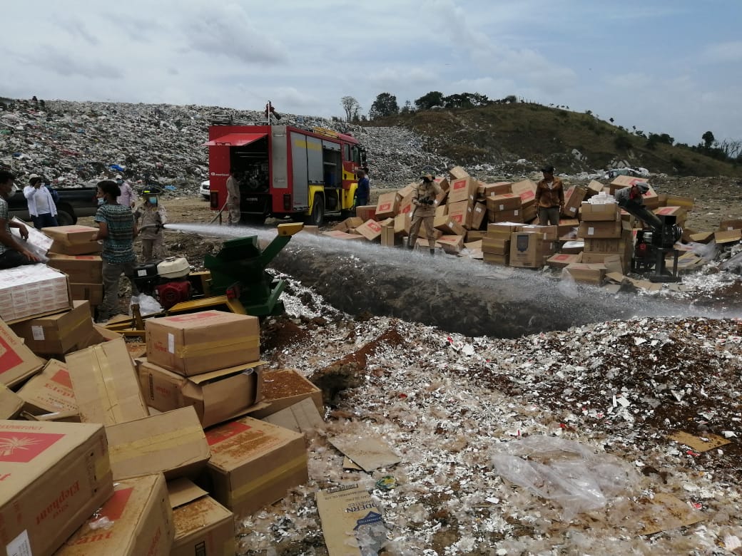 Más de 450 cajas de cigarrillos fueron decomisadas y destruidas en las instalaciones del Relleno Sanitario, ubicado en la aldea Ocotillo, municipio de San Pero Sula, departamento de Cortés.