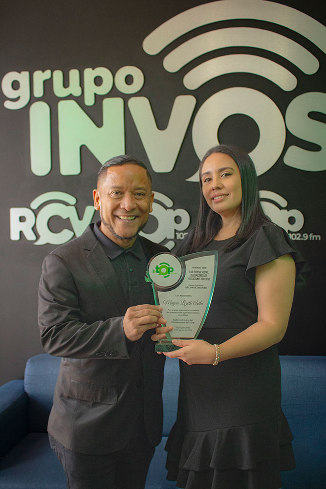 El presidente ejecutivo de Grupo INVOSA, Leonel Giannini, y el director de La Top 107.7 FM, Edgardo Rivera, fueron los encargados de entregar el reconocimiento a Ávila, destacando su impacto positivo en la industria de la comunicación y las relaciones públicas, para inspirar a quienes la rodean.
