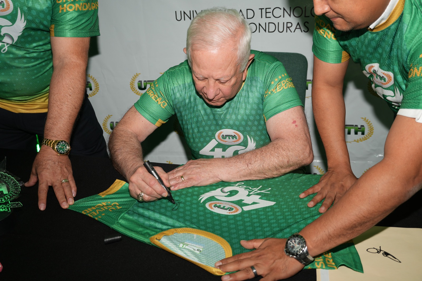 Como cierre simbólico del lanzamiento, Roger D. Valladares firmó personalmente la única edición de la camisa conmemorativa de los 40 años, convirtiéndola en una pieza histórica que encarna liderazgo, valores y compromiso permanente con la formación de los hondureños.