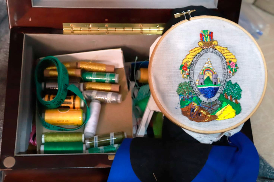 El trabajo se realiza en jornadas cuidadosas, aprovechando la luz natural del día. Valladares dedica entre dos y tres horas diarias al bordado, deteniéndose cuando la vista se fatiga, consciente de que cada detalle debe honrar lo que representa.