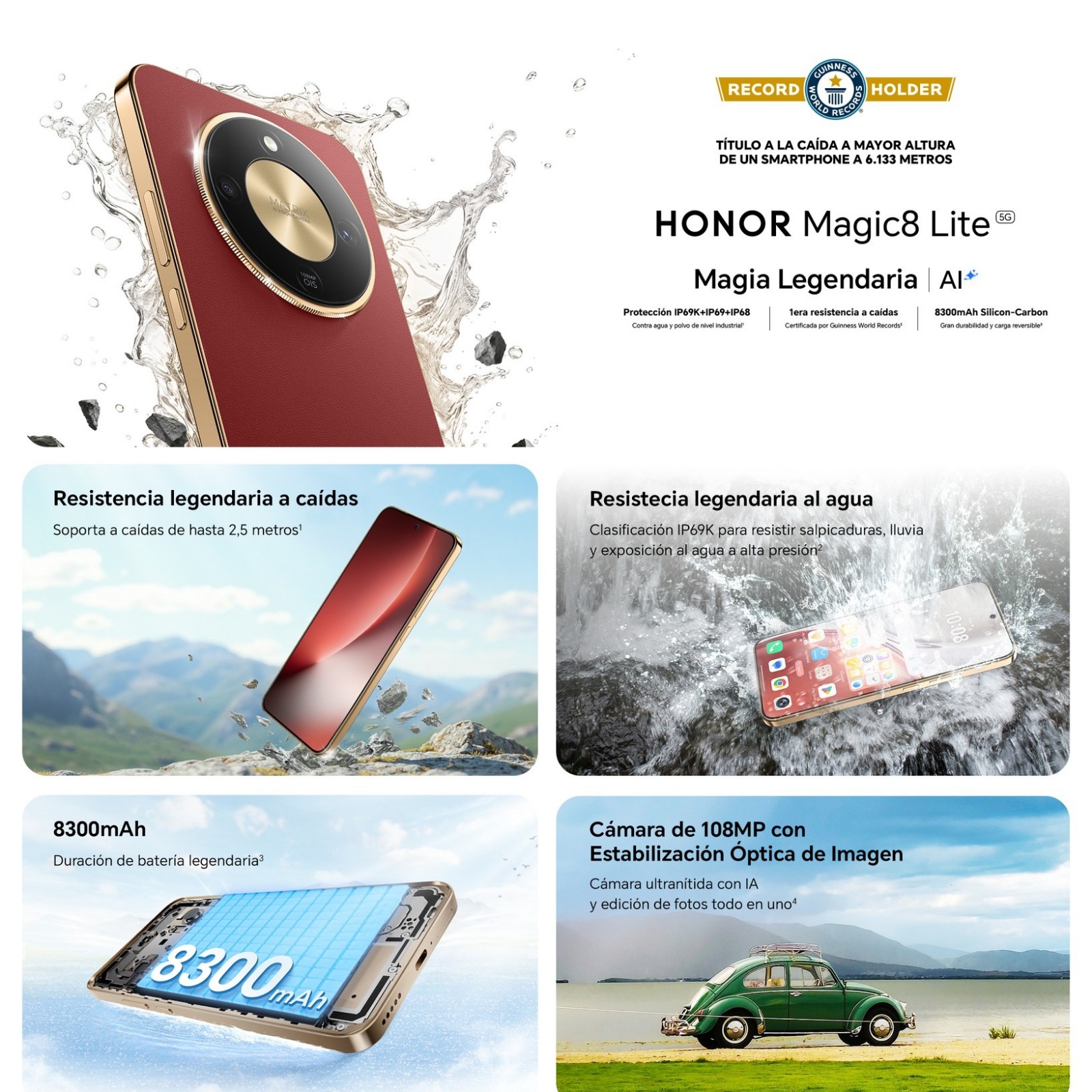 Con el título de Guinness World Records a la caída a mayor altura de un smartphone desde 6.133 metros, logrado en Dubai, Emiratos Árabes Unidos el 29 de septiembre de 2025, el HONOR Magic8 Lite demuestra la efectividad de su estructura de 6 capas con tecnología HONOR Ultra-Bounce Anti-Drop y Corning® Gorilla® Glass Victus® 2. Gracias a esta combinación, el dispositivo es capaz de resistir caídas de hasta 2.5 metros sobre superficies rugosas como asfalto, adoquines y granito.