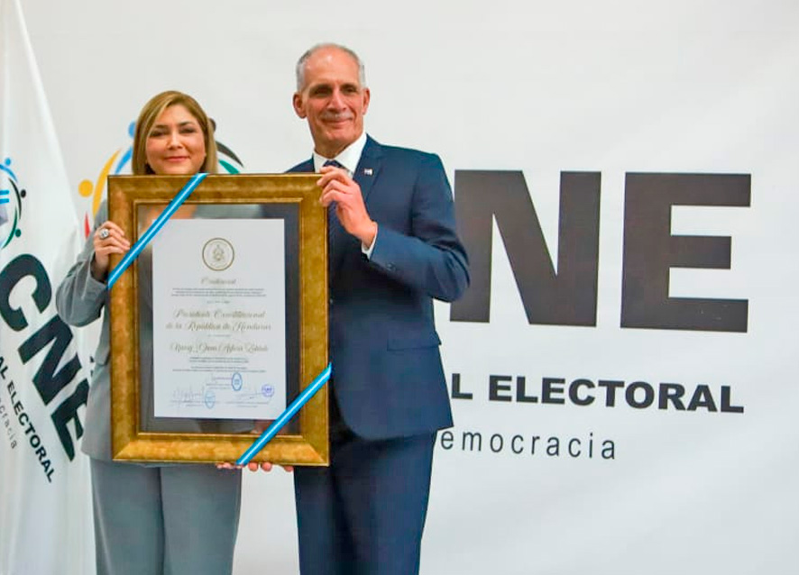 La presidenta del Consejo Nacional Electoral (CNE), Ana Paola Hall, entregó este miércoles la credencial oficial a Nasry Asfura, quien asume como Presidente Constitucional de la República de Honduras para el período 2026–2030, dando por concluido formalmente el proceso electoral.