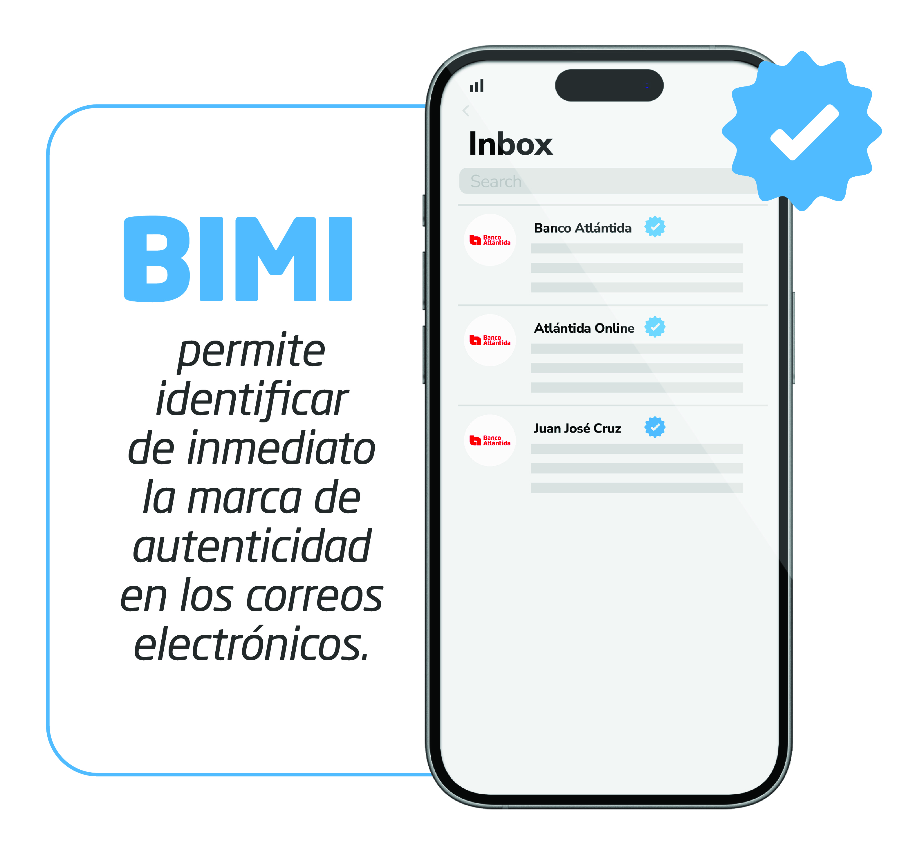 BIMI es una tecnología que permite identificar de inmediato la marca de autenticidad en los correos electrónicos, reconociendo el logotipo de la empresa directamente en su bandeja de entrada, ayudando al cliente a evitar engaños, previniendo fraudes y ataques de phishing.