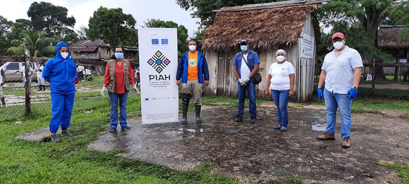 PIAH financiado por la Unión Europea e implementado por el consorcio Ayuda en Acción, FUNACH, GOAL y MIMAT entregan alimentos y kits de bioseguridad a más de 300 familias indígenas de la comunidad de Mocorón en Gracias a Dios que se dedican a la producción y distribución de miel y madera.