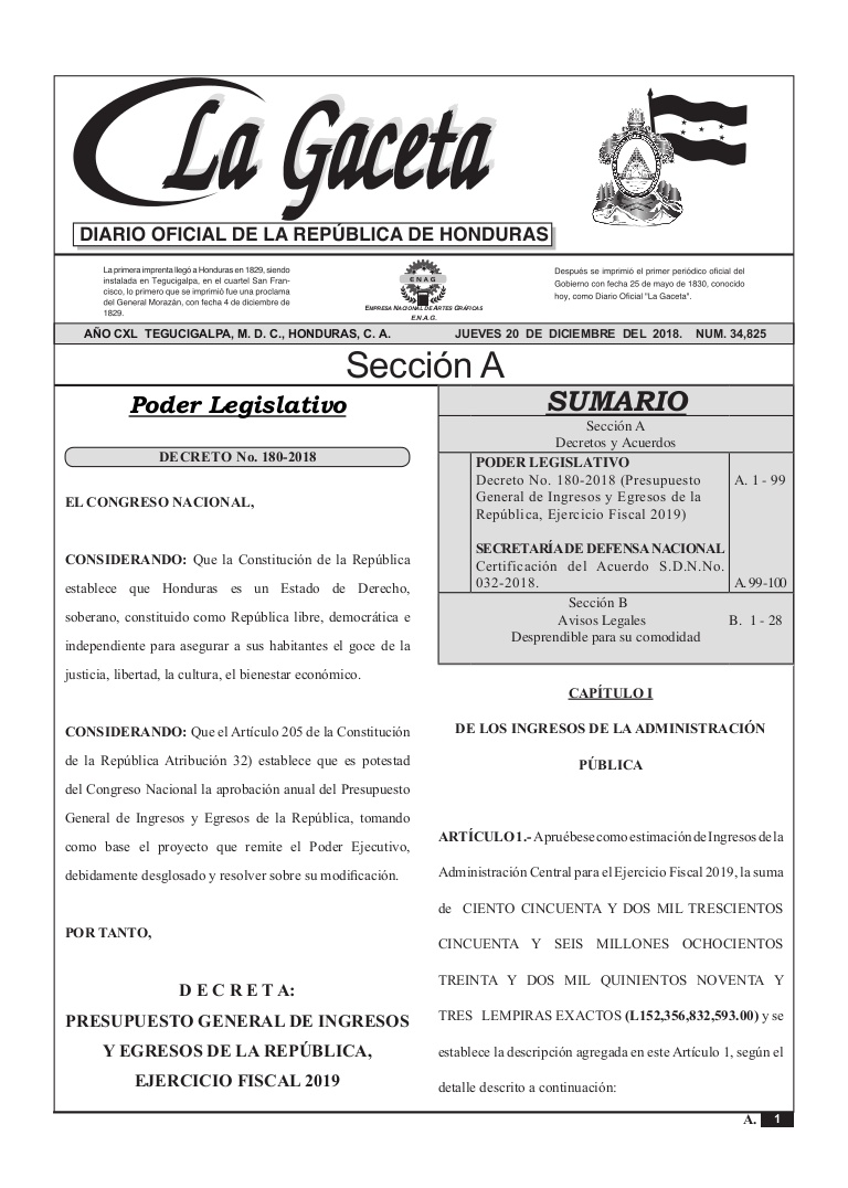 El Presupuesto General de la República para el ejercicio fiscal 2020, fue publicado en el diario oficial La Gaceta el pasado 31 de diciembre, por un monto de 282 mil 405 millones de lempiras, cantidad que es superior en 7.9 por ciento al aprobado para 2019.