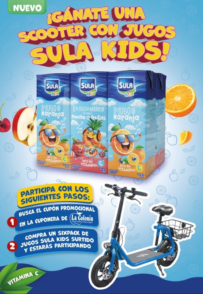 Esta increíble promoción consiste en buscar el cupón promocional en la Cuponera de supermercados La Colonia, comprar un six-pack surtido de las bebidas con sabor a naranja y ponche de frutas Sula Kids, recibirá un 20% de descuento en la compra y automáticamente estará participando en la rifa quincenal de Scooter eléctricas.