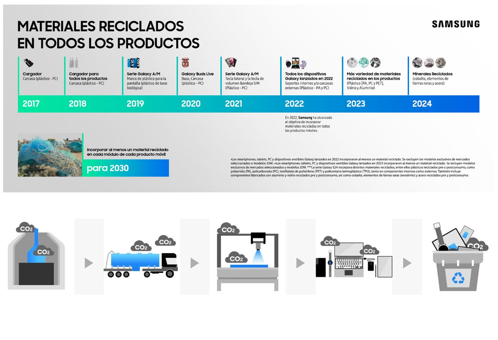Samsung incorpora cada vez más materiales reciclados en sus productos, incluido el plástico procedente de redes de pesca desechadas en los dispositivos Galaxy, plástico reciclado en televisores y aluminio reciclado en frigoríficos Bespoke.