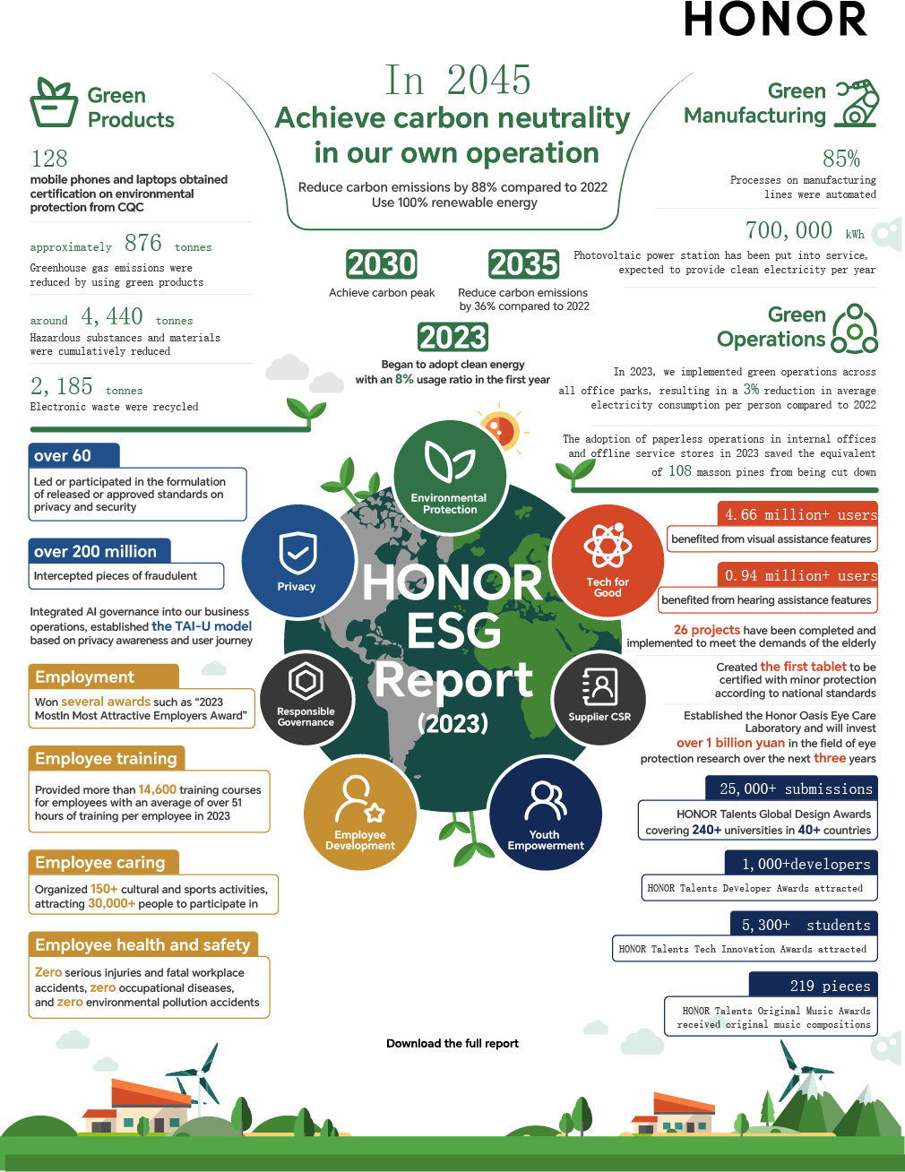 Como destacada marca global de tecnología, HONOR sitúa los principios ESG como un enfoque estratégico a largo plazo, que abarca siete áreas clave: Protección Ambiental, Tecnología para el Bien, Privacidad, Empoderamiento Juvenil, Responsabilidad Social de los Proveedores, Desarrollo de Empleados y Gobernanza Responsable.