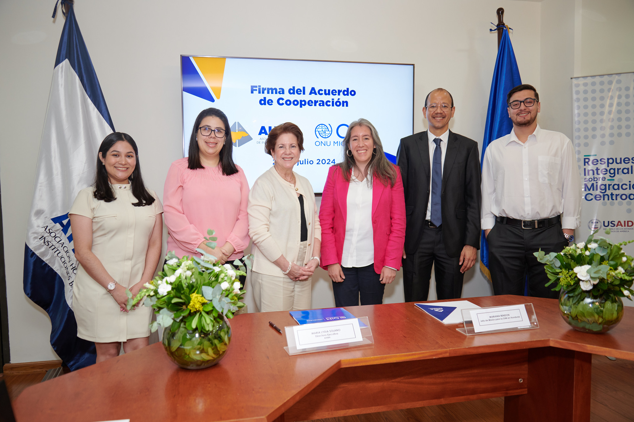 María Lydia Solano, Directora Ejecutiva de AHIBA, en representación de Don Manuel Venancio Bueso, Presidente, y Mariana Rendón, Jefe de Misión para Honduras, de OIM (Organización Internacional de Migraciones) firmaron un Acuerdo de Cooperación que permitirá un abordaje integral para la reinserción económica de los migrantes retornados.