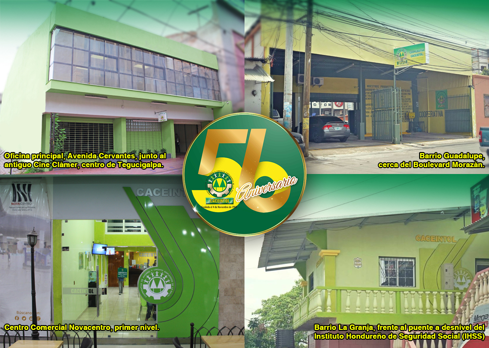 Hoy, Cooperativa CACEINTOL cuenta con cuatro filiales estratégicamente ubicadas para brindar servicios ágiles y accesibles a sus afiliados: Barrio La Granja, frente al puente a desnivel del Instituto Hondureño de Seguridad Social (IHSS). Barrio Guadalupe, cerca del Boulevard Morazán. Centro Comercial Novacentro, primer nivel. Y la oficina principal en la Avenida Cervantes, junto al antiguo Cine Clámer en el centro de Tegucigalpa.