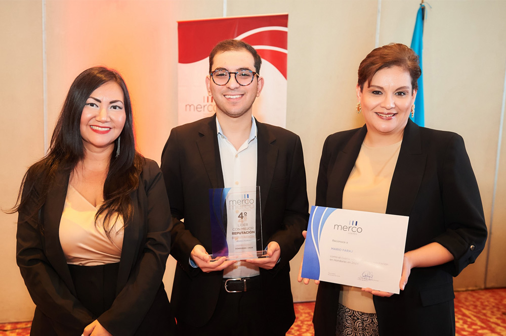 En representación del destacado empresario, Mario Alejandro Faraj Gabrie, jefe de mercadeo de Diunsa, recibió el reconocimiento y el certificado de Merco, que entregaron Carlos Lancha, director corporativo de Merco e Isabel Zapata, directora general de Merco en Honduras.