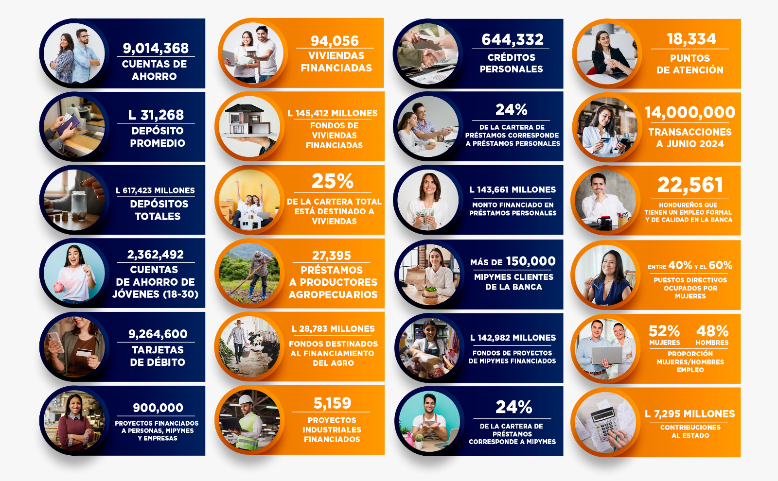 Con transacciones seguras e inmediatas. “Estamos en todo el país, para llevar los beneficios del Sistema Bancario a cada hondureño y así promover su inclusión financiera”, explicó Liana Fortín, Directora de Comunicaciones de AHIBA. Ofrecen 456 puntos de servicio por cada 100 mil habitantes. A junio del 2024, realizaron 14 millones de transacciones bancarias Por un monto de 450 millones de lempiras De manera virtual o presencial, los Bancos están comprometidos a apoyar a los hondureños en sus necesidades financieras. EMPLEO: La Banca de Honduras brinda empleo formal y de calidad a miles de hondureños en todo el país: Los Bancos de Honduras demuestran con hechos sus políticas de inclusión e igualdad de oportunidades: Entre el 40% y 60% de puestos directivos son ocupados por mujeres Cuentan con programas de inserción de personas con discapacidad 52% de sus colaboradores son mujeres, y el 48% son hombres.