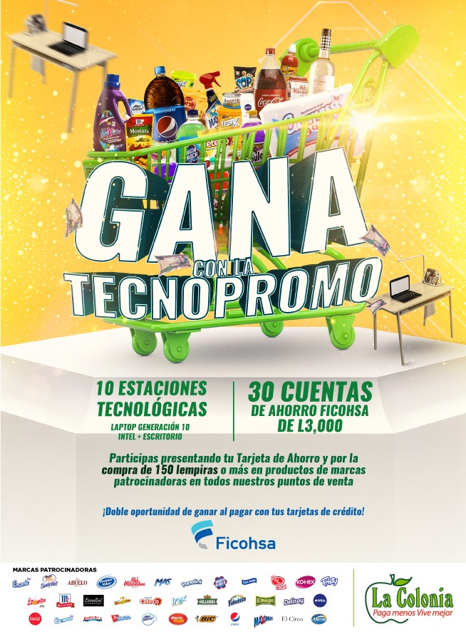 Supermercados La Colonia, la cadena líder en promociones, sorprende una vez más a su fiel clientela, en esta ocasión con el lanzamiento de su más reciente promoción “Gana con la Tecnopromo”. En el cual podrás ser el acreedor de una de las 10 estaciones tecnológicas que incluye computadora portátil con procesador Intel de décima generación y escritorio; además de ganar una de las 30 cuentas de ahorro de Banco Ficohsa de 3,000 lempiras cada una.