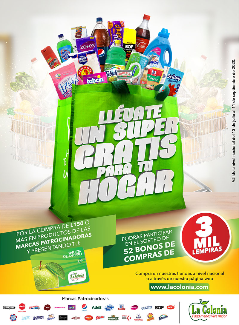 Supermercados La Colonia, la cadena líder en promociones, premia la preferencia de los hondureños con su más reciente promoción de temporada “Llévate un super gratis para tu hogar”, en la cual podrás ser el acreedor de uno de los 52 bonos de compras, valorado en 3 mil lempiras cada uno.