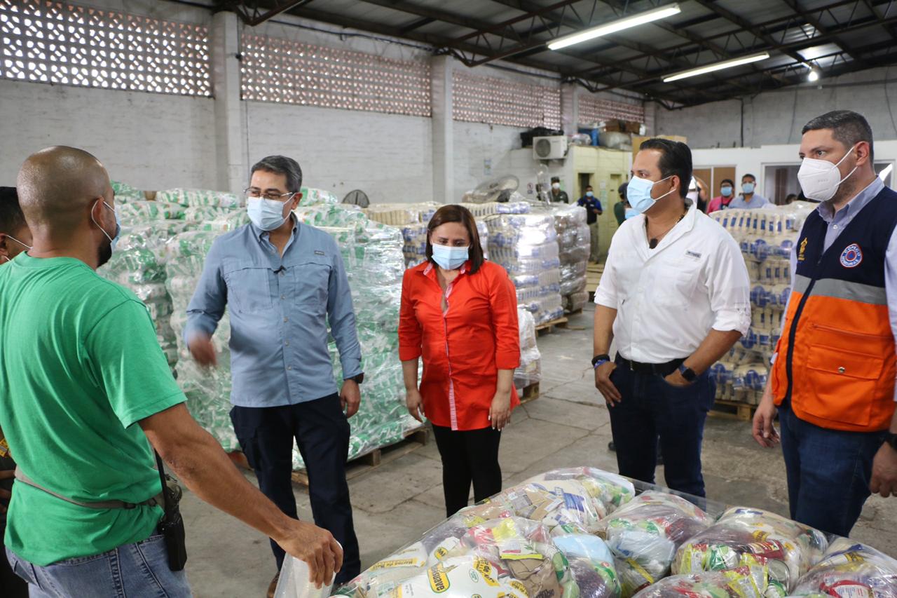 El mandatario Juan Orlando Hernández llegó hoy a la bodega de proyectos de la Suplidora Nacional de Productos Básicos (BANASUPRO), para supervisar el envío de las primeras raciones de alimento para los compatriotas damnificados por la tormenta tropical IOTA.