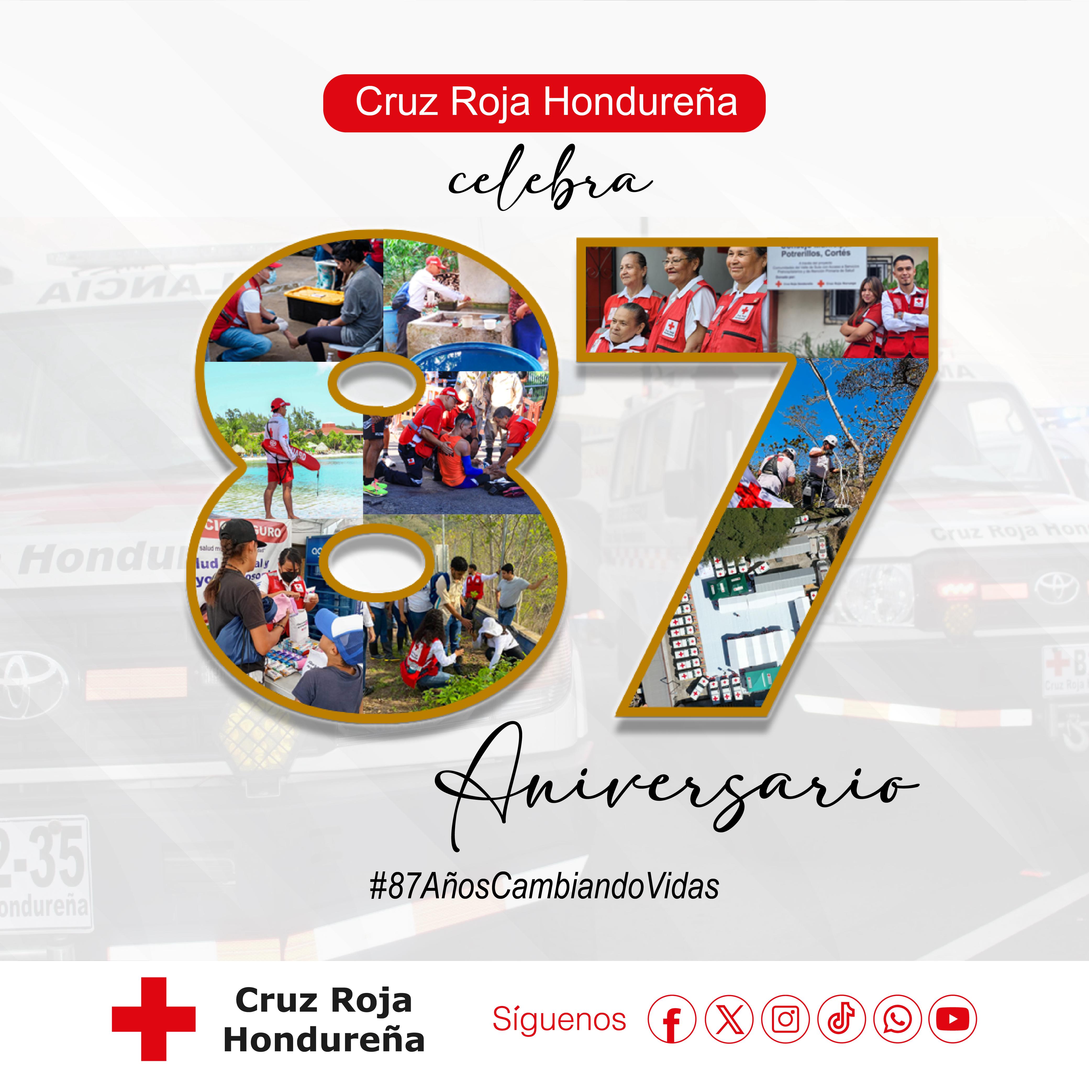 — Cruz Roja Hondureña se enorgullece en conmemorar su 87° aniversario de labor incansable al servicio de la población más vulnerable. Desde su fundación en 1937, la institución ha mantenido su misión de prevenir y aliviar el sufrimiento humano, brindando asistencia en momentos de emergencia, crisis y desastres y en procesos desarrollo a las comunidades a través de programas de gestión para la reducción de riesgos a desastres, salud comunitaria y desarrollo social.